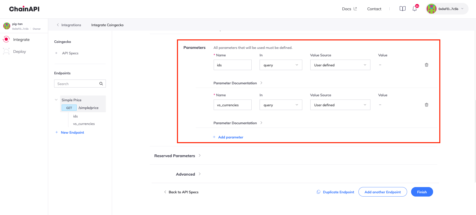 Reserved parameters define what part of the response is to be picked and encoded before fulfillment. It can be defined by the requester or can also be hardcoded in the Airnode configuration. To hardcode the reserved parameters, click on Reserved Parameters to define the parameter's _name, _path and _times.
