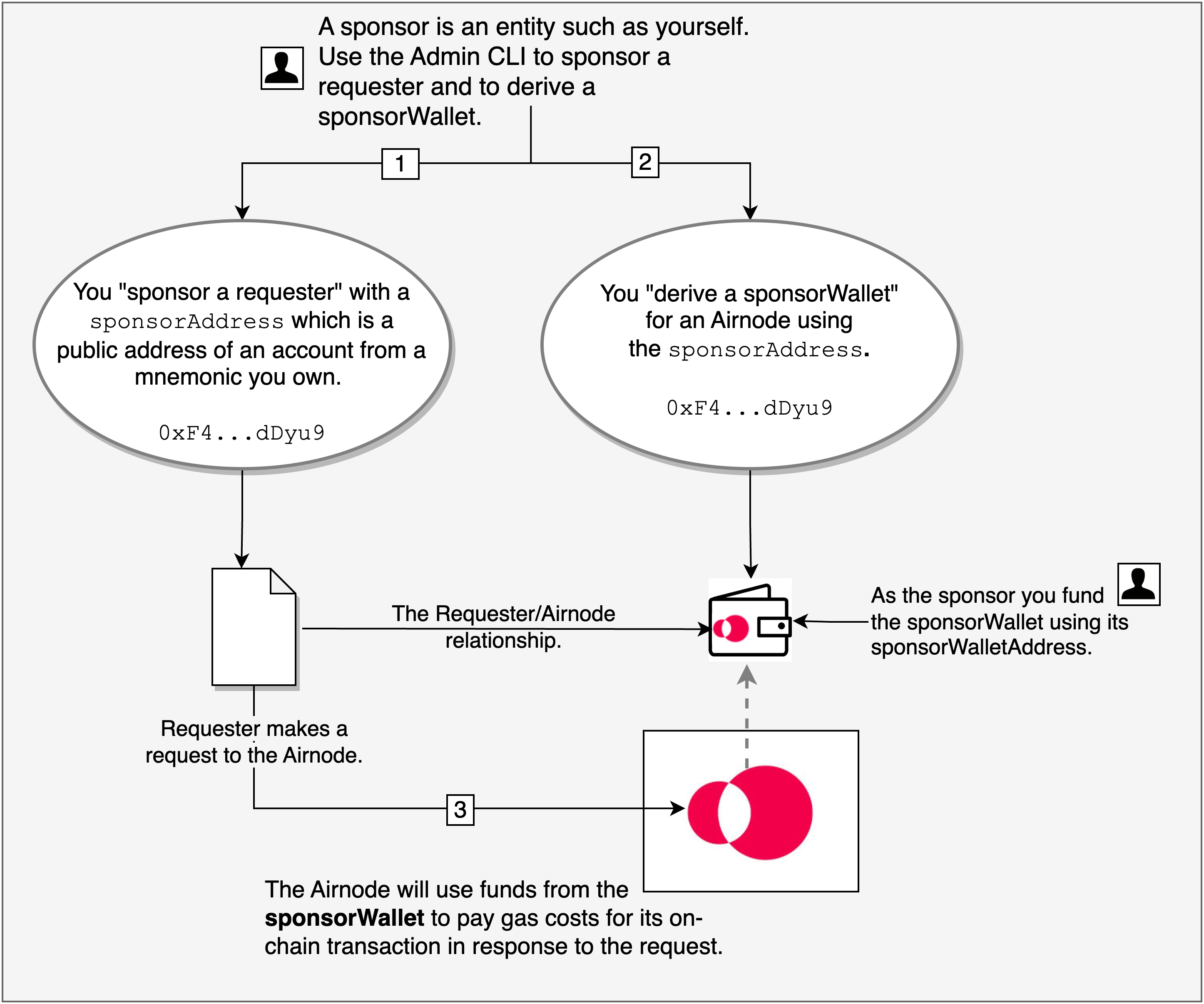 As a sponsor you will use the public address from an account within a mnemonic you own to "sponsor a requester" and then use the public address (known as a sponsorAddress) to "derive a sponsorWallet" for an Airnode. This action creates a relationship between a sponsor's requester and a particular Airnode. You do this because a sponsor is the entity that pays for the fulfillment of a request, the gas costs the Airnode will incur. These costs will be withdrawn from the sponsorWallet of the Airnode when the requester calls it.
